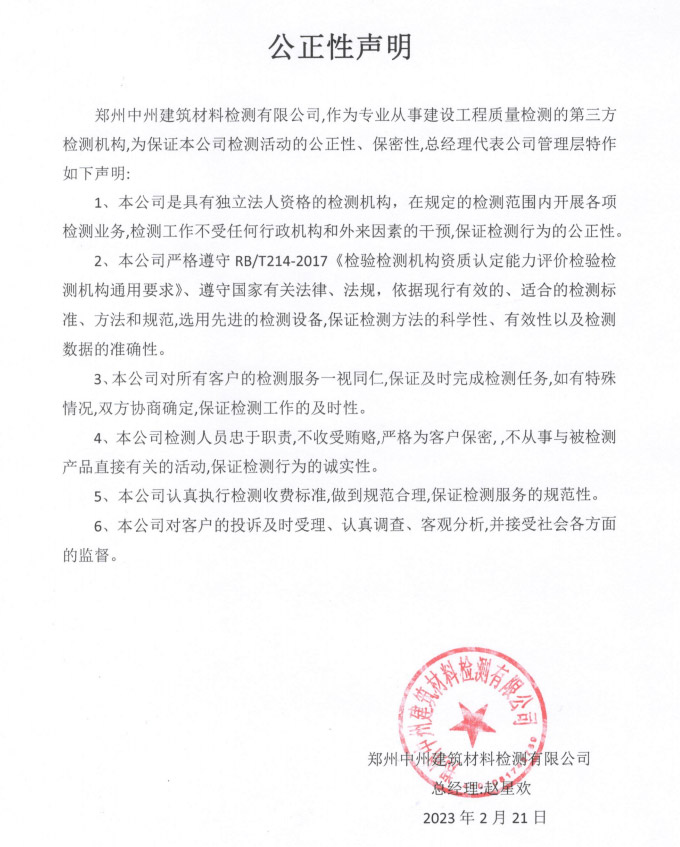 通過河南省質量技術監督局計量認證、河南省住房和城鄉建設廳批準,具有獨立法人資格的第三方檢測機構。